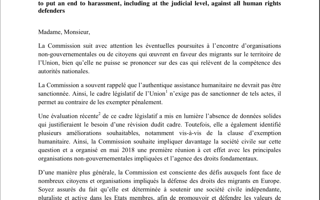 La Commission européenne a communiqué ce jour son intervention auprès de l’État français et des autorités européennes afin qu’ils mettent un terme au harcèlement, notamment juridique, à l’encontre des organisations non-gouvernementales et des citoyens qui œuvrent en faveur des migrants sur le territoire de l’Union. La Commission se dit « déterminée à soutenir une société civile indépendante, pluraliste et active dans les États membres, afin de promouvoir et défendre les valeurs de l’Union et les droits fondamentaux en son sein ».